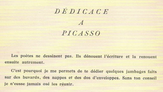 (orig. << Les poรจtes ne dessinent pas. Ils dรฉnouent lโ€™รฉcriture et la renouent ensuite autrement. Cโ€™est pourquoi je me permets de to dรฉdier quelques jambages faits sur des buvards, des nappes et des dos dโ€™enveloppes. Sans ton conseil je nโ€™eusse jamais osรฉ les rรฉunir. >>)