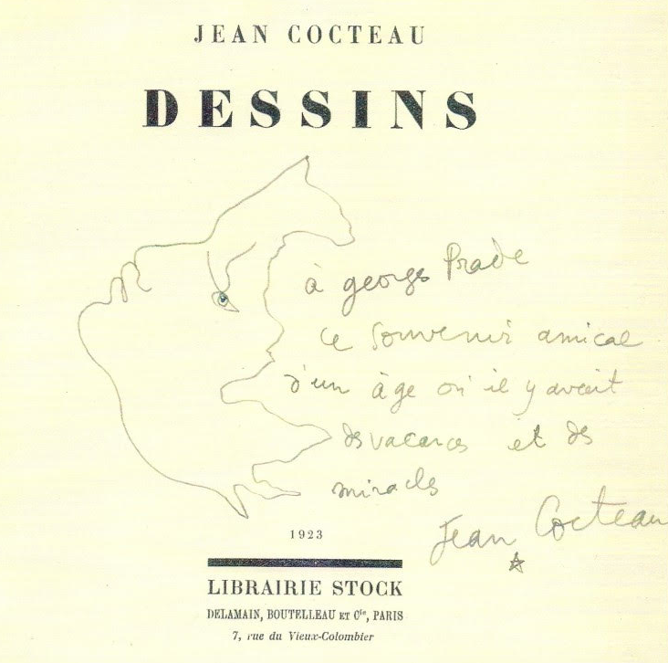 The collection of drawings was dedicated by Cocteau to his and Pradeโ€™s mutual friend, Picasso, with the dedication: (again my translationโ€ฆ)